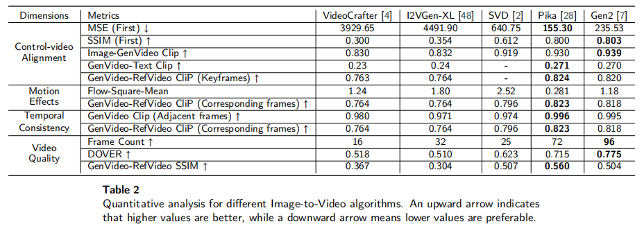 - 图像保真度(MSE/SSIM/Image-GenVideo CLIP):Pika(MSE=155.30,SSIM=0.800)和 Gen2(MSE=235.53,SSIM=0.803)表现最佳,远优于开源模型(如 VideoCrafter 的 MSE=3929.65,SSIM=0.300);