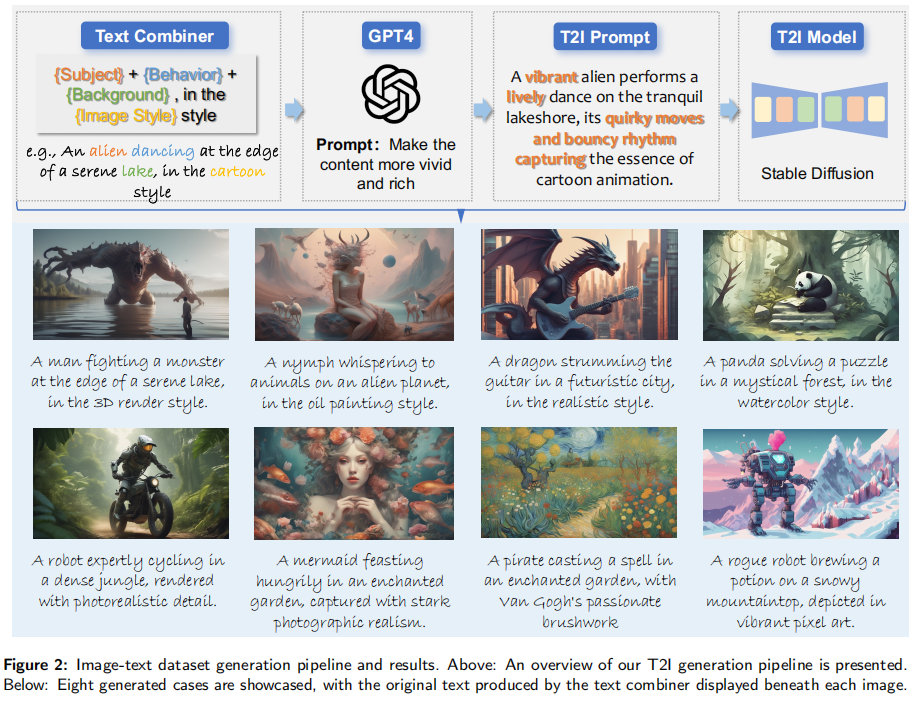 注:上侧为生成流水线(文本组合器→GPT-4 优化→Stable Diffusion 生成),下侧为 8 个生成示例,每个示例下方标注了文本组合器生成的原始文本。