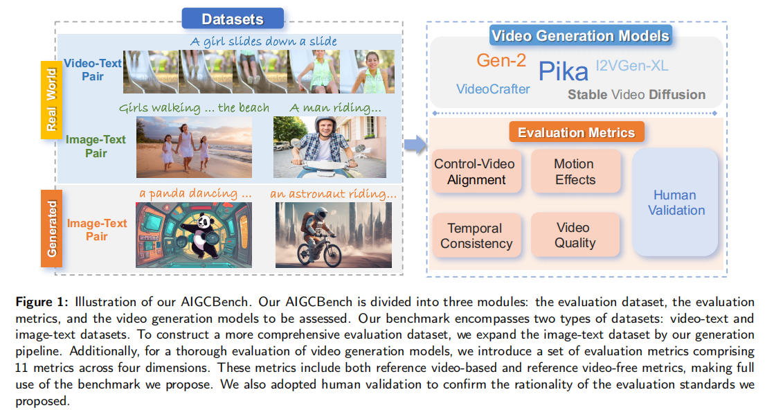 注:图中展示了 AIGCBench 的三大模块:评估数据集(视频 - 文本对、图像 - 文本对)、待评估模型(如 Pika、SVD 等)、评估指标(四大维度共 11 项指标),同时通过人工验证确保评估标准的合理性。