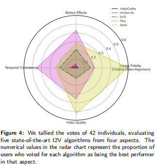 注:数值表示用户投票该算法为 “某维度最佳” 的比例,维度包括图像保真度、运动效果、时间一致性、视频质量。