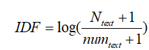 其中,num_text表示包含当前词的文档个数,N_text表示总文档个数。即IDF表示逆文档频率 (Inverse Document Frequency),用于衡量某个词在所有词库中的重要程度。分子加1的目的是:使IDF值始终大于等于零,分母加1的目的是:防止出现分母为零的情况。