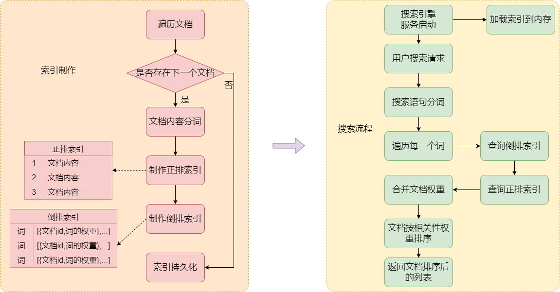 倒排索引以关键词为索引key,当用户输入某些关键词进行查询时,就可以快速定位到包含该关键词的文档id列表,再根据文档id列表从正排索引获取文档内容,从而将相关文档返回给用户。