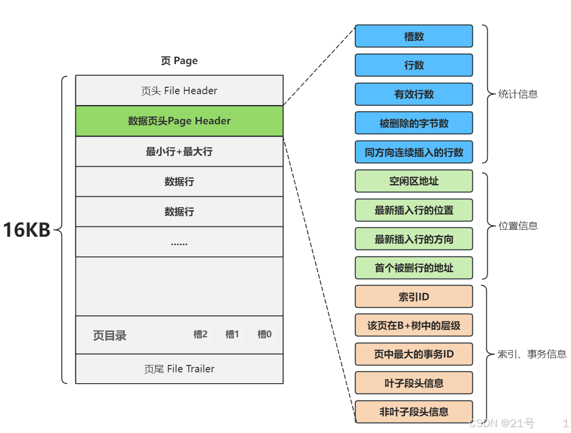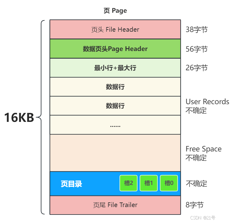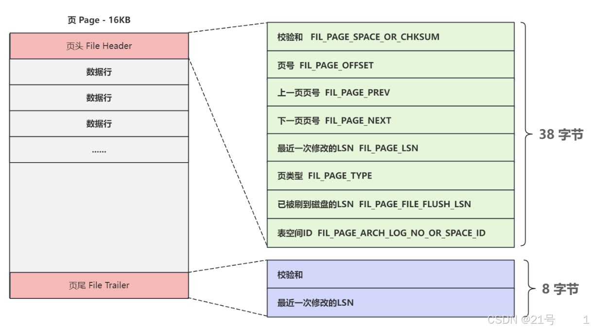 1 row in set, 1 warning (0.04 sec)在不同的使⽤场景中,⻚的结构也有所不同,在MySQL中有多种不同类型的⻚,但不论哪种类型的⻚都会包含⻚头(File Header)和⻚尾(File Trailer),在这⻚头和⻚尾之间的⻚主体信息根据不同的类型有不同的结构,最常⽤的就是⽤来存储数据和索引的"索引⻚",也叫做"数据⻚",⻚的主体信息使⽤数据"⾏"进⾏填充,⻚的基本结构如下图所⽰: