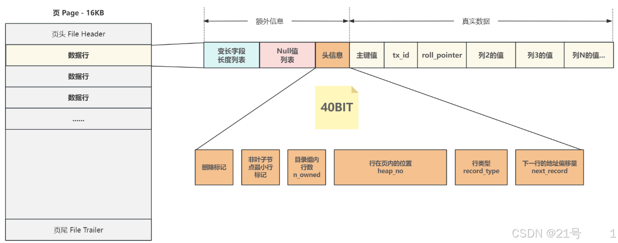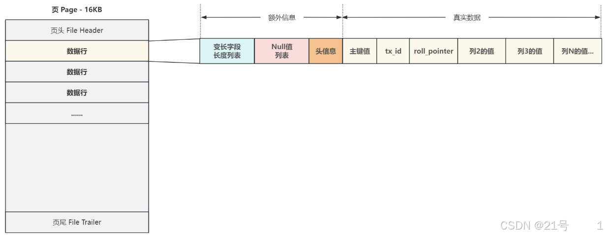 • ⾄于为什么不存储NULL值,原因很简单,就是为了节少空间,所有允许为NULL的列都会在⾏额外信息区的NULL值列表中进⾏标识,后⾯我们会详细详解,以上就是数据⾏对真实数据的存储⽅