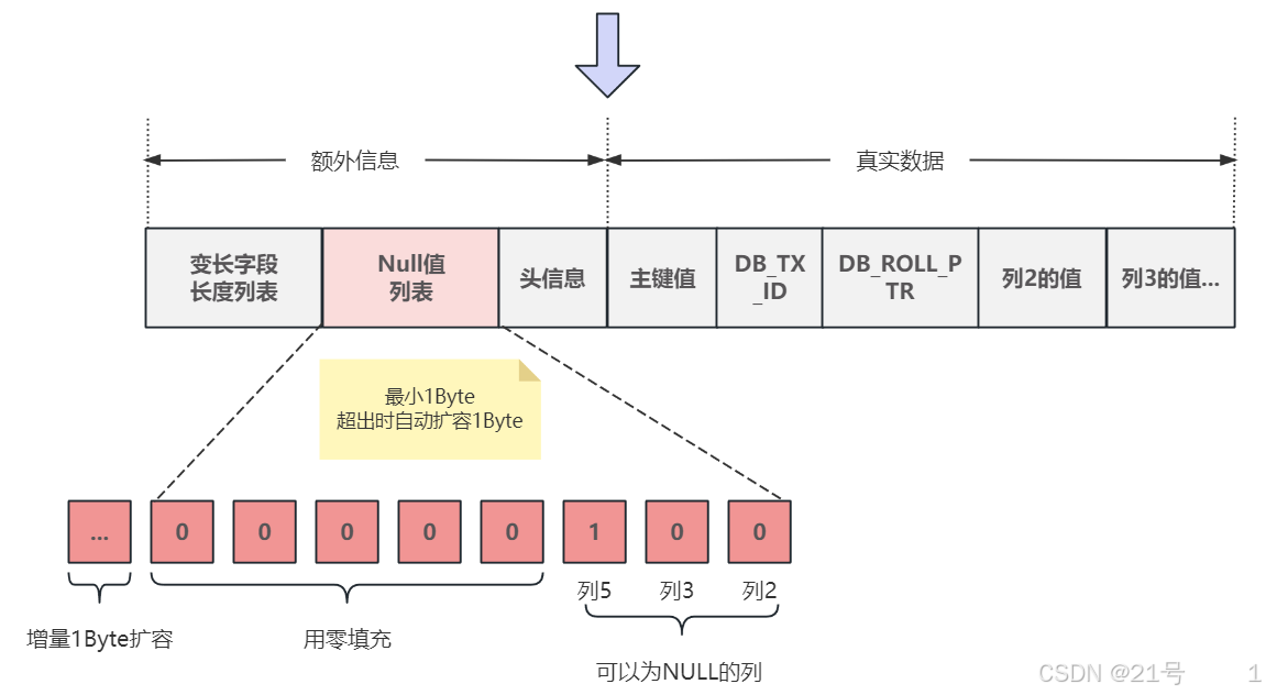 • 为每个没有定义 NOT NULL 约束也就是可以为NULL的列在NULL值列表中都安排了⼀个bit位,按列序号从⼩到⼤的顺序从右⾄左依序安排,这就是常说的逆序排列,NULL值列表最⼩1字节即