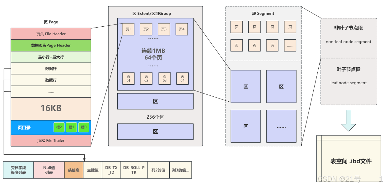 • 为了⽅便管理,表空间由段 (segment)、区组(group)、区 (extent)、⻚ (page) 、数据⾏组成,