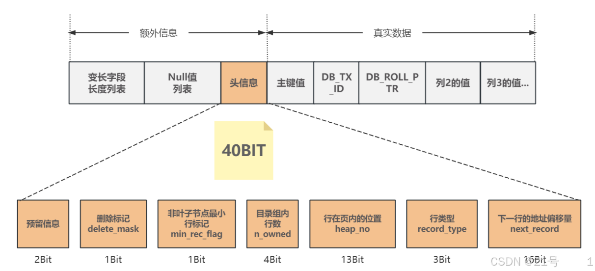 • ⾏在整个⻚中的位置: heap_no 占13bit;