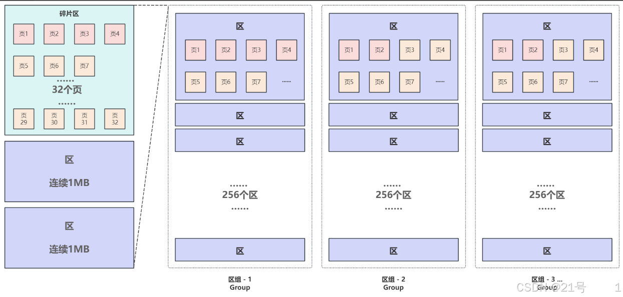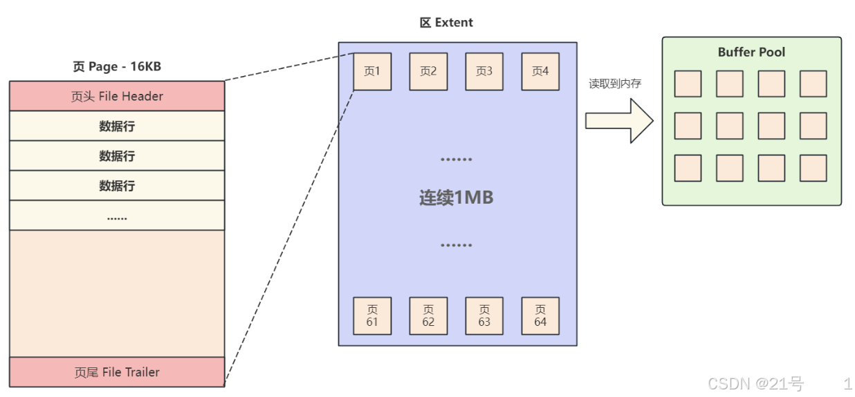 • 为了解决磁盘随机访问⾮常低效的问题,需要尽可能在磁道上读取连续的数据,减少磁头的移动,从⽽提升效率,MySQL使⽤ Extent(区) 这个结构来管理⻚,规定每个区固定⼤⼩为 1MB ,可以存放 64 个⻚,这时如果跨⻚读数据时,⼤概率都在附近的地址,可以⼤幅减少碰头移动;