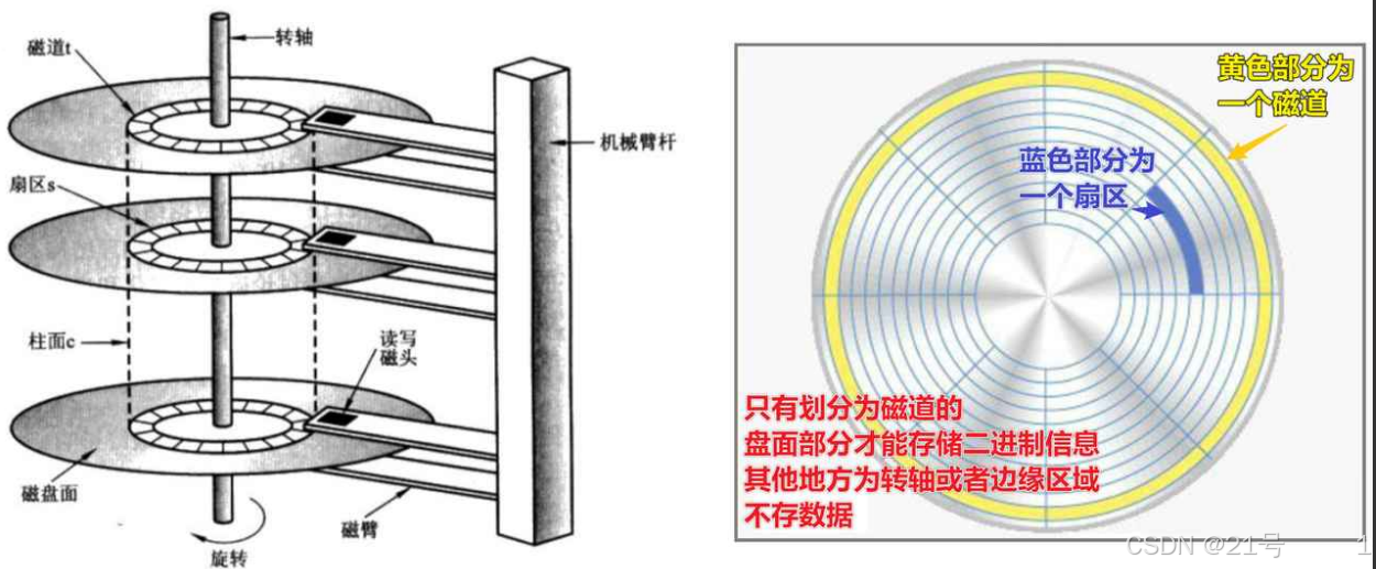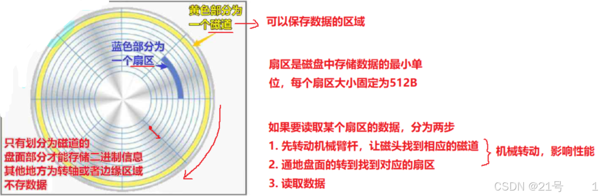 • 当存储介质是机械硬盘时,访问不连续的地址会带来磁盘寻址的开销,也就是磁头在不同盘⾯、磁道和扇区的机械转动,这个过程称为磁盘随机访问,⾮常影响效率,磁盘结构如下图所⽰: