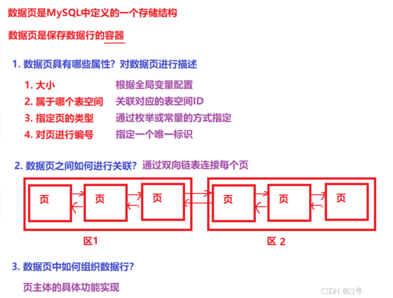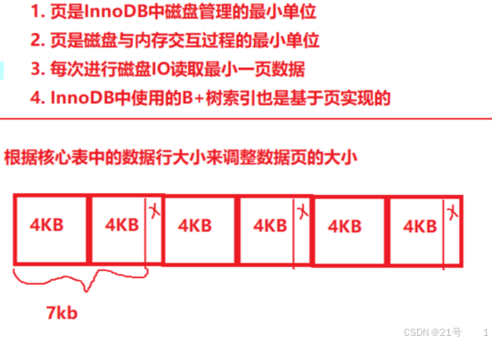 • 通常操作系统中的⽂件系统在管理磁盘⽂件时以4KB⼤⼩为⼀个管理单元,称为"数据块",但是在数据库的应⽤场景⾥,查询时数据量都⽐较⼤,如果也使⽤4KB做数据存储的最⼩的单元,就显的有点⼩了,同时会造成频繁的磁盘I/O,导致降低效率;