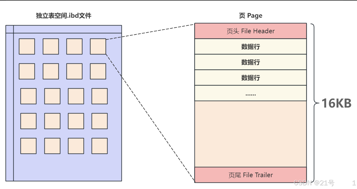• 所以MySQL根据⾃⾝情况定义了⼤⼩为16KB的⻚,做为磁盘管理的最⼩单位;