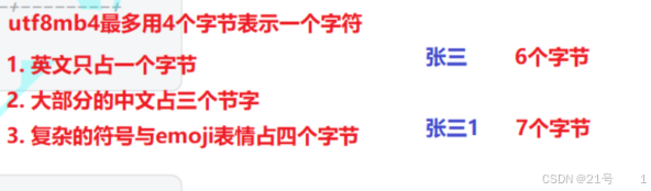 个字节, utf8mb4 最⼤4个字节,如下所⽰