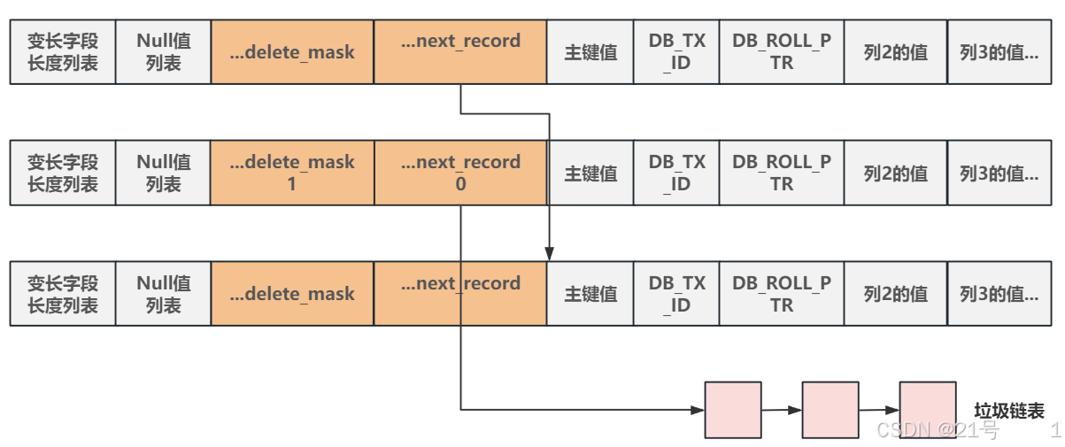 断开,如果执⾏事务提交后,则将这⾏的 next_record 指向⼀个被称为垃圾链表的区域,这个