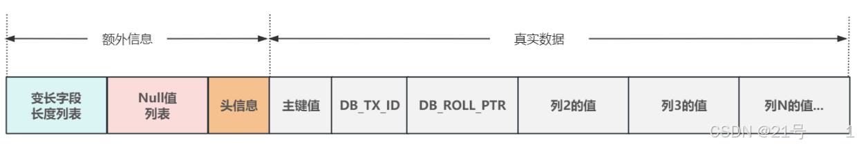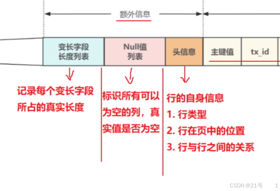 • ⾏结构的最左侧是变⻓字段列表,也叫可变字段⻓度列表,在这个列表中记录了数据⾏中所有变⻓字段的实际⻓度,这样做的⽬的,是为了在真实数据区域,可以根据列的⻓度进⾏列与列之间的分割;