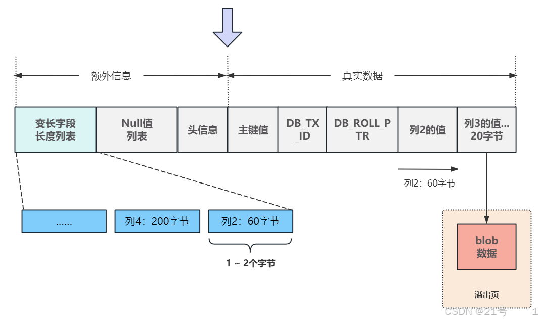 • 每个变⻓字段分配1 ~ 2个字节来存放这些字段的真实⼤⼩,放置顺序也是按表中字段的顺序从右⾄左逆序排列;