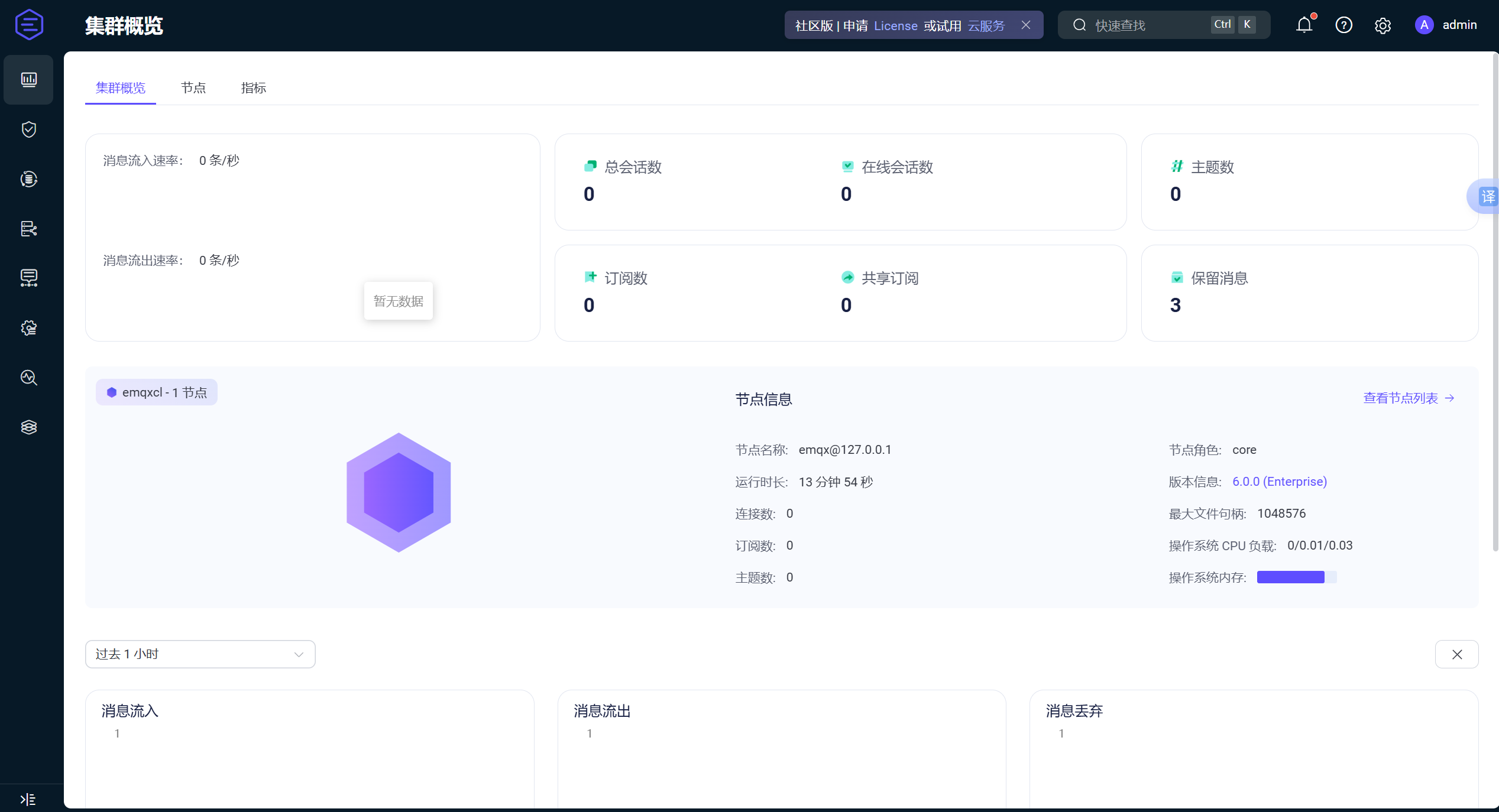 登录成功后,你可以在Dashboard上查看客户端连接数、消息吞吐量等监控信息