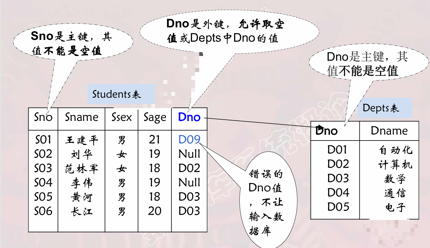 [例2.1]中 学生关系中每个元组的“专业号”属性只取两类值: (1)空值,表示尚未给该学生分配专业 (2)非空值,这时该值必须是专业关系中某个元组的“专 业号”值,表示该学生不可能分配一个不存在的专业