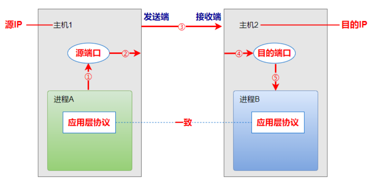 在⽹络通信中,IP地址⽤于标识主机⽹络地址,端⼝号可以标识主机中发送数据、接收数据的进程。 简单说:端⼝号⽤于定位主机中的进程。 类似发送快递时,不光需要指定收货地址(IP地址),还需要指定收货⼈(端⼝号)。