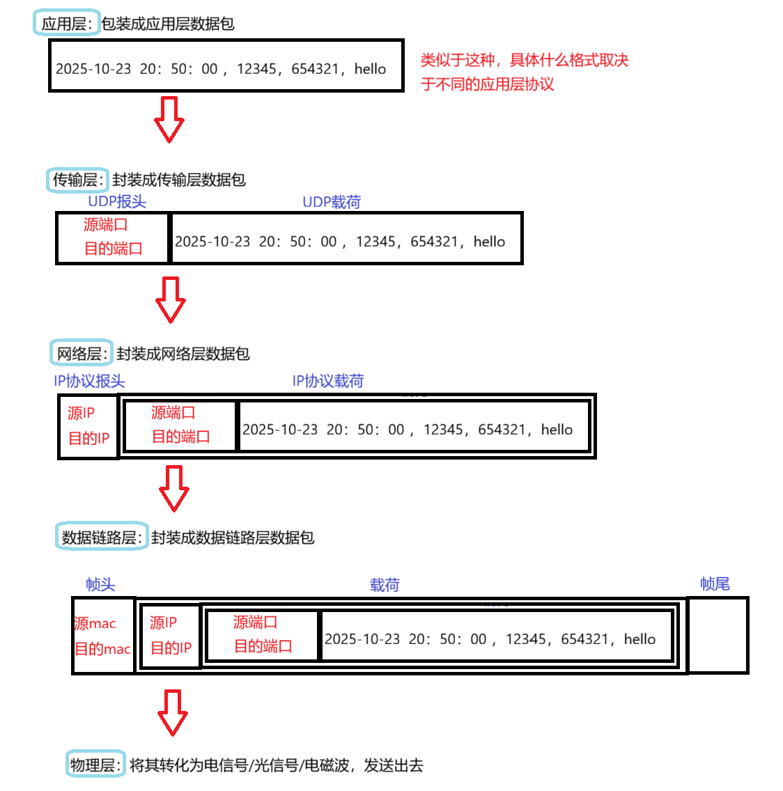 注意我们是在发送方本地把应用层数据包逐步封装成物理层数据包才发送出去,而不是在传输的过程中再依次的封装--物理层是数据能实际传输的“最终出口”