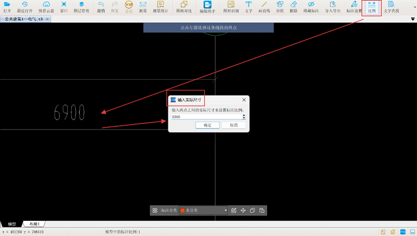 3. 鉴于该平面图采用1:150比例,需使用CAD快速看图中【比例】功能进行校准。任意量取图中线段并输入实际尺寸,方便后续量取配线工程量。