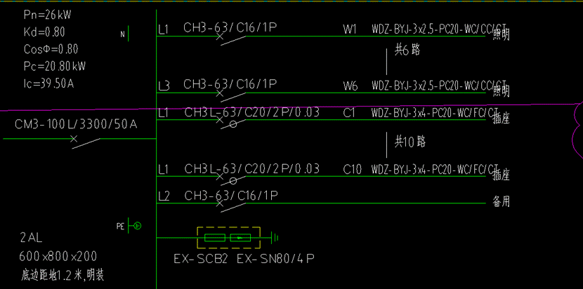 1.观察二层照明平面图、2AL配电箱详图和主要材料表,L1配线为WDZ-BYJ-3x2.5,L3配线为WDZ-BYJ-3x2.5,铺设方法为WC/CC/CT。