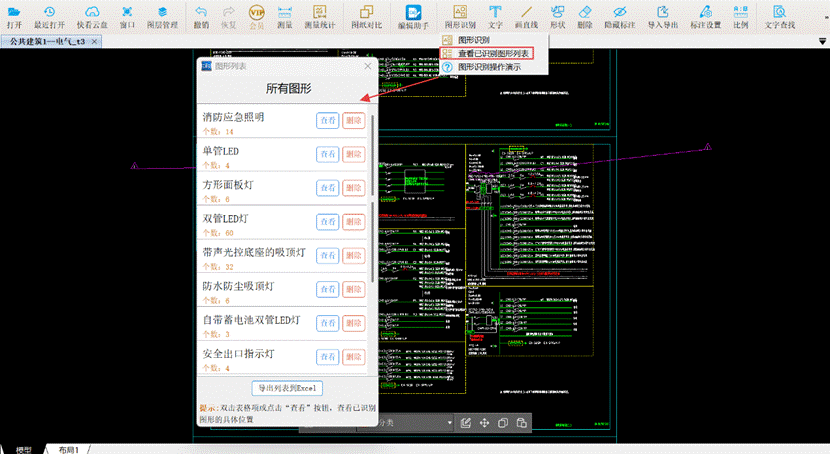 2. 在上一期“照明器具”工程量计算方法中,我们介绍了如何运用CAD快速看图软件快速计算照明灯具的工程量。通过【屏幕旋转】功能可将图纸旋转校正,再借助【图形识别】功能精准提取二层照明平面图中的照明器具与开关工程量,具体工程量如下图所示: