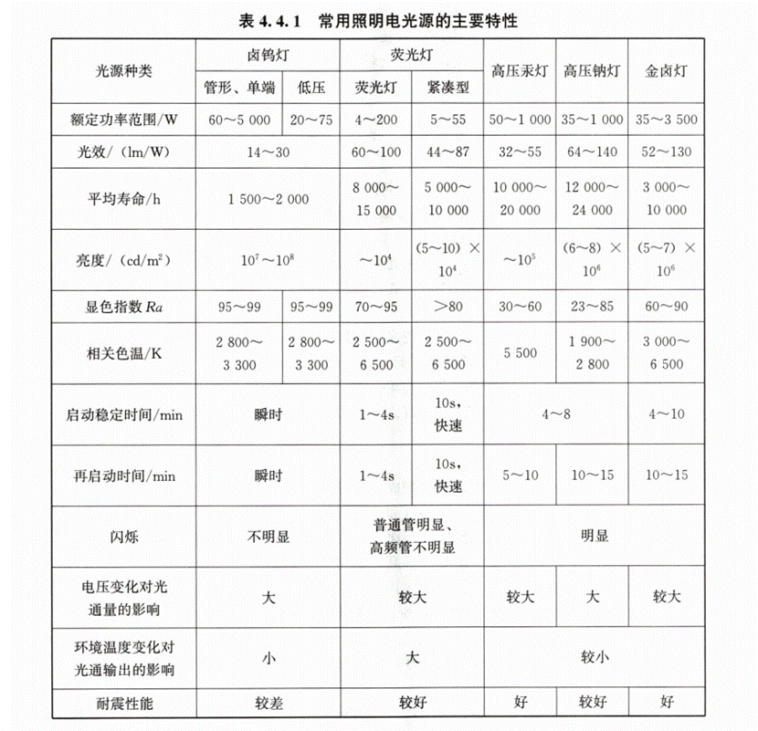 气体放电光源一般比热辐射光源光效高、寿命长,能制成各种不同光色,在电气照明中应用日益广泛。热辐射光源结构简单,使用方便,显色性好,故在一般场所仍被普遍采用。常用照明电光源的主要特性比较如表4.4.1所示。