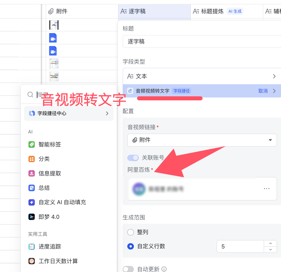 创建一个文本类型的字段,编辑字段-搜索捷径-找到-音视频转文字-关联自己的阿里百炼账号,完成。