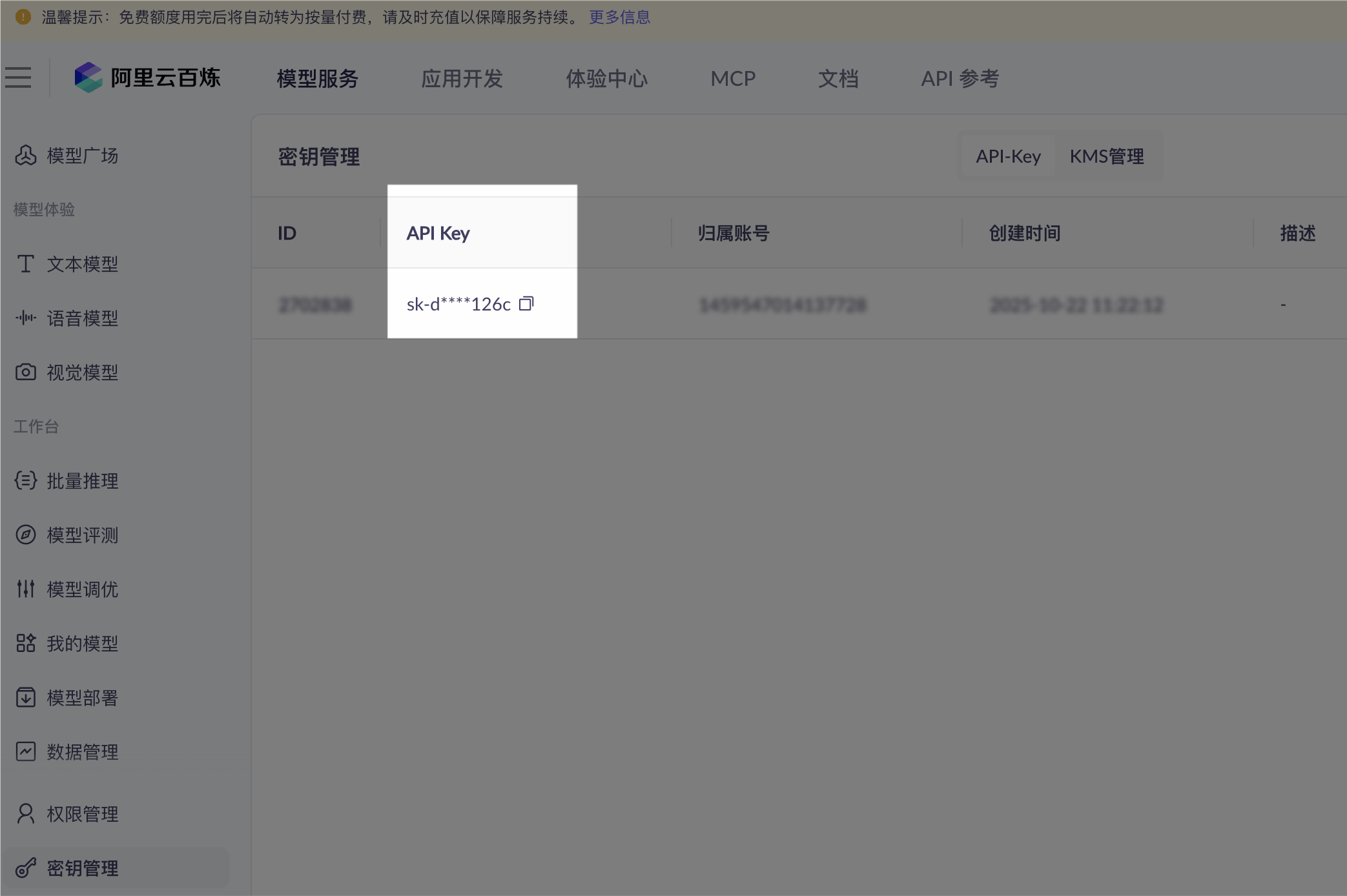 找到:https://bailian.console.aliyun.com/ 登录找到自己的key。 目前看是免费使用。