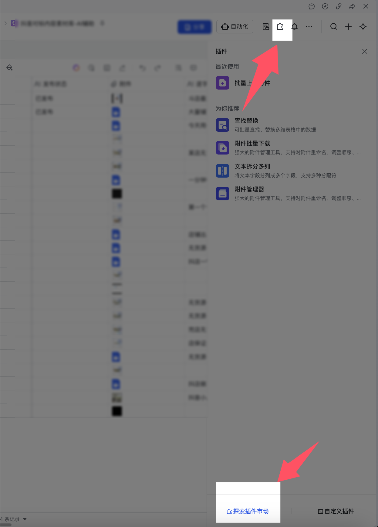 创建飞书多维表格,选一个支持上传附件的序列,这里面有个小技巧,就是用到飞书多维表格插件市场-批量上传。如截图。