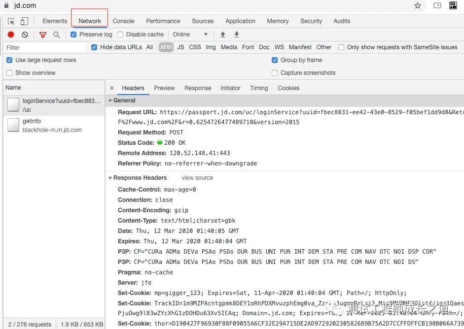首先来看下jd 登录接口,chrome浏览器打开www.jd.com, 使用chrome开发者工具, Windows用户按键盘F12, 将tab切换到Network, 使用密码登录方式, 登录成功后, 我们就可以获取到登录接口了,如果无法获取,使用charles第三方工具也是妥妥的.