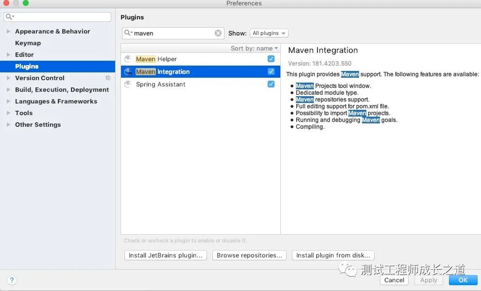 如果你的IDE里没有maven,也不用着急, 在菜单的Preference->plugs里可以添加所需插件