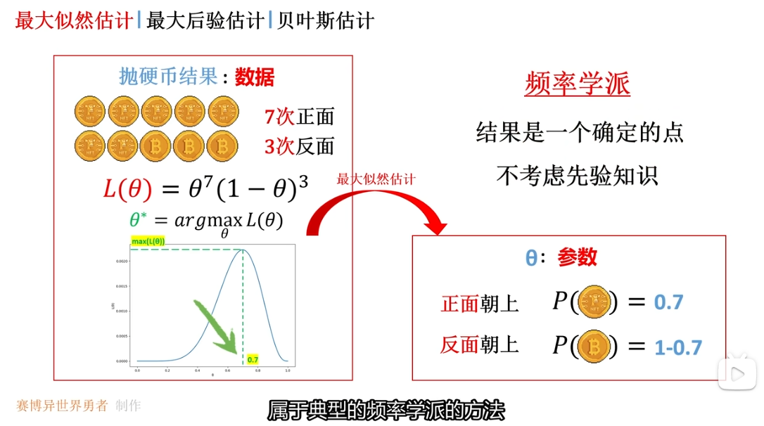 - 直觉上,你会觉得 “正面概率p=0.7” 最合理 —— 因为如果p=0.7,抛出 7 正 3 反的概率比p=0.5(公平硬币)或p=0.3(反面倾向)都要大。