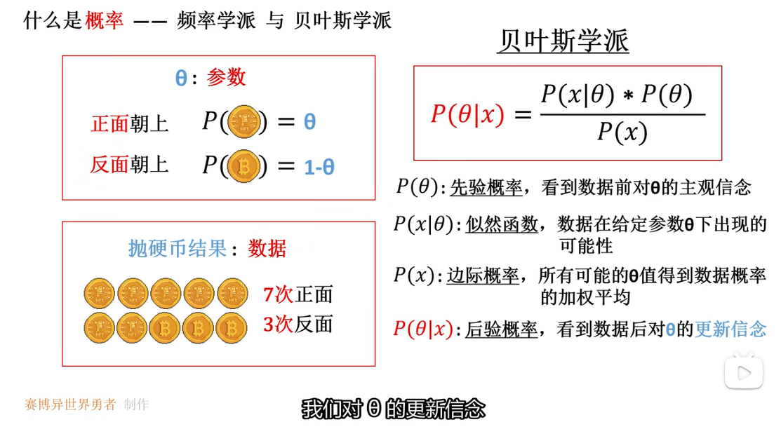 - 概率:已知参数θ,预测数据X发生的可能性(如已知硬币p=0.5,求抛 10 次得 5 正的概率);