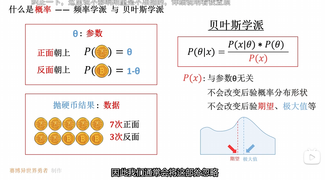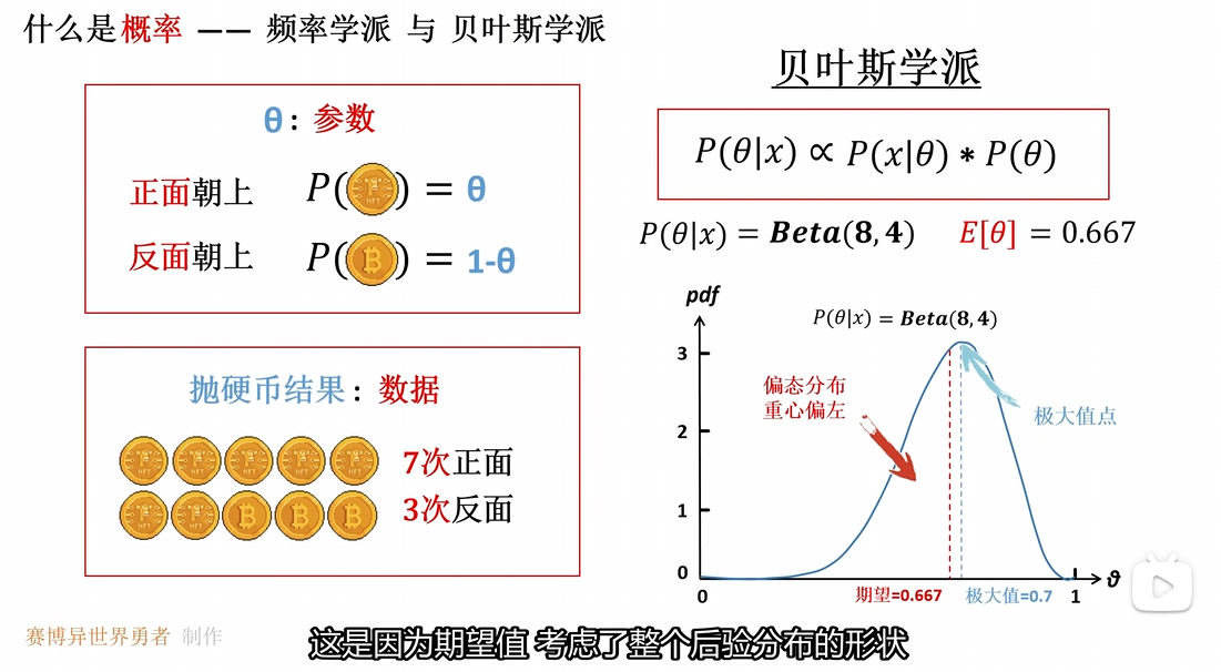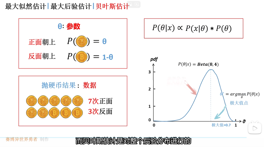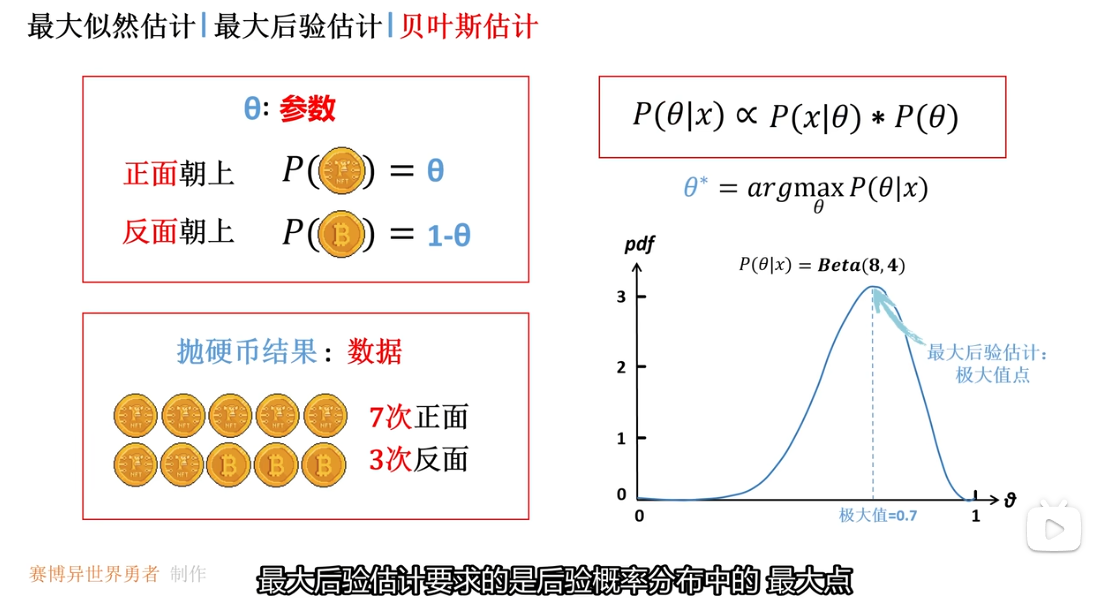 - 似然:已知数据X,反推参数θ的可能性(如已知抛 10 次得 7 正,求p=0.7的可能性)。