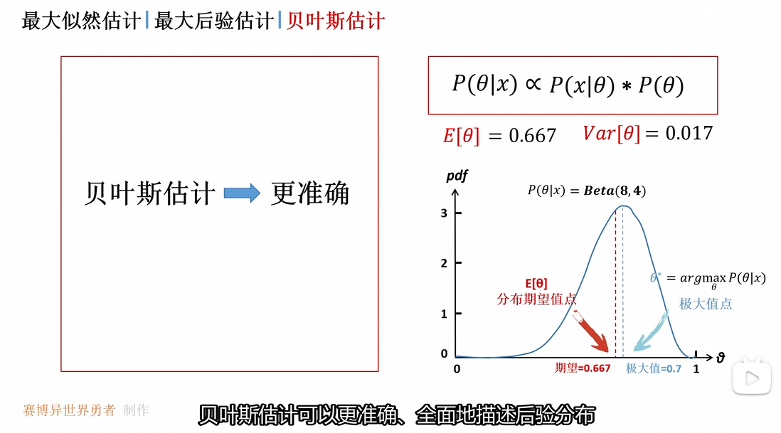 贝叶斯估计并没有取到后验概率分布的最大值数 而是使用了期望值 这是因为期望值考虑了整个后验分布的形状 当前后验分布是一个偏态分布 最大值点偏向边缘 因此使用期望值可以更好地表征后验概率分布