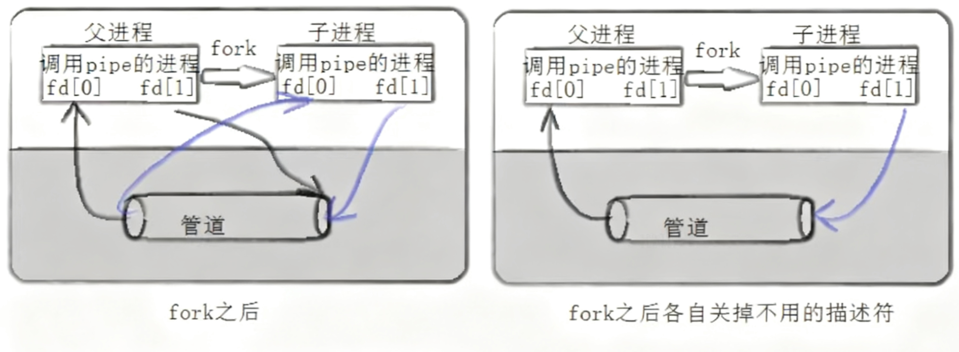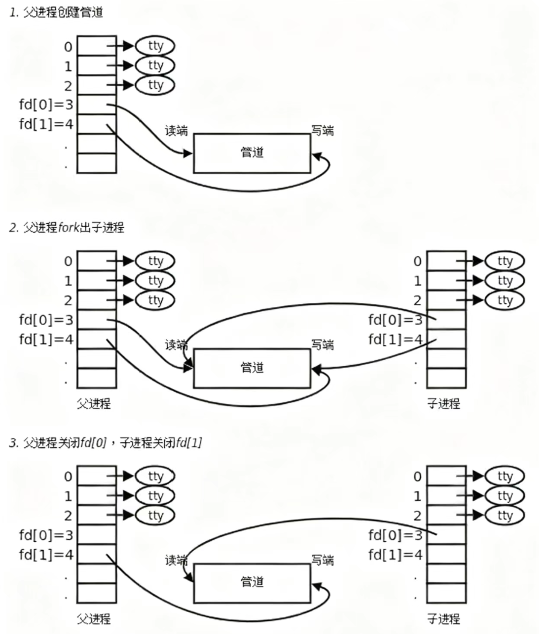 • 仅适用于具有亲缘关系的进程间通信,通常由父进程创建管道后调用fork,实现父子进程间的数据传输