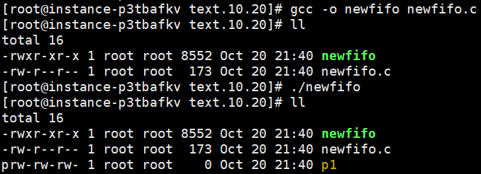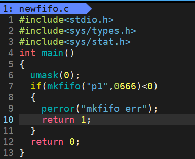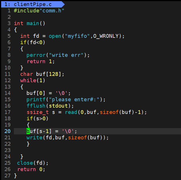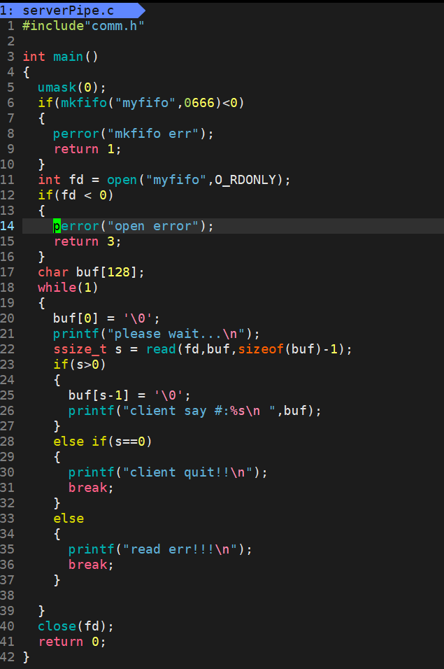 int main(int argc, char *argv[]){mkfifo("tp", 0644);int infd;infd = open("abc", O_RDONLY);if (infd == -1) ERR_EXIT("open");int outfd;outfd = open("tp", O_WRONLY);if (outfd == -1) ERR_EXIT("open");char buf[1024];int n;while ((n=read(infd, buf, 1024))>0){write(outfd, buf, n);}close(infd);close(outfd);return 0;}