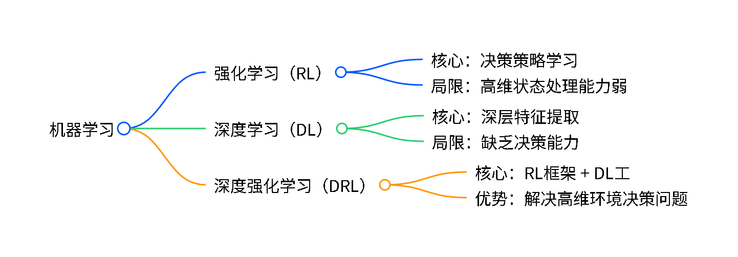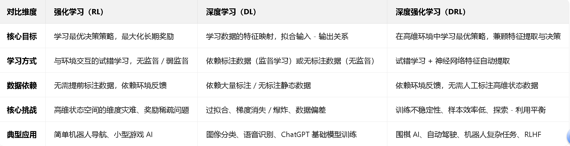 - 数据处理:RL 依赖环境交互数据,DL 依赖静态标注 / 无标注数据,DRL 依赖高维环境的交互数据。