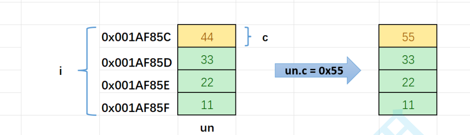 代码1输出的三个地址⼀模⼀样,代码2的输出,我们发现将i的第4个字节的内容修改为55了。 我们仔细分析就可以画出,un的内存布局图。