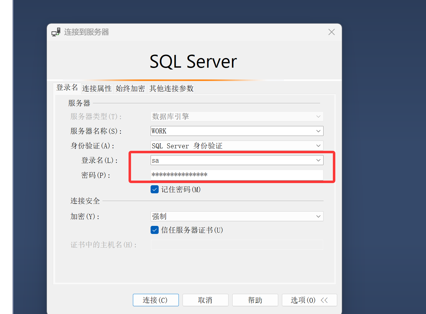 sa账号对应的密码(需与 SSMS 中设置一致);