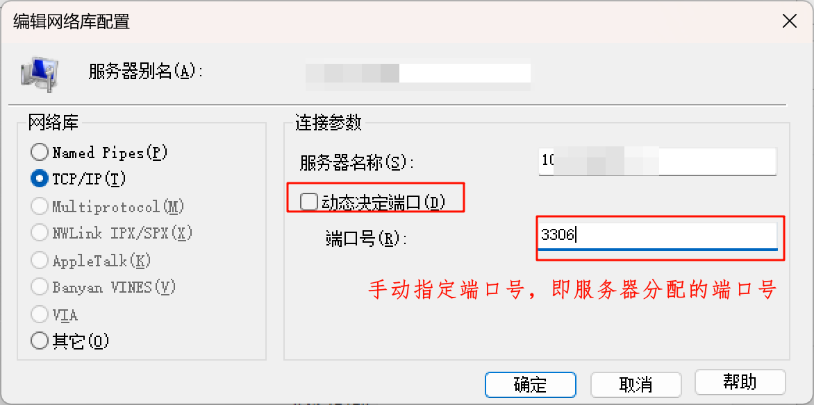 - 取消 “动态决定端口 (D)”,在 “端口号 (R):” 中填写远程服务器分配的 SQL Server 端口(博客示例为 “3306”,实际 SQL Server 默认端口为 “1433”,需按服务器配置填写,若端口错误必失败);