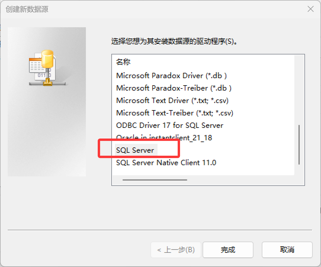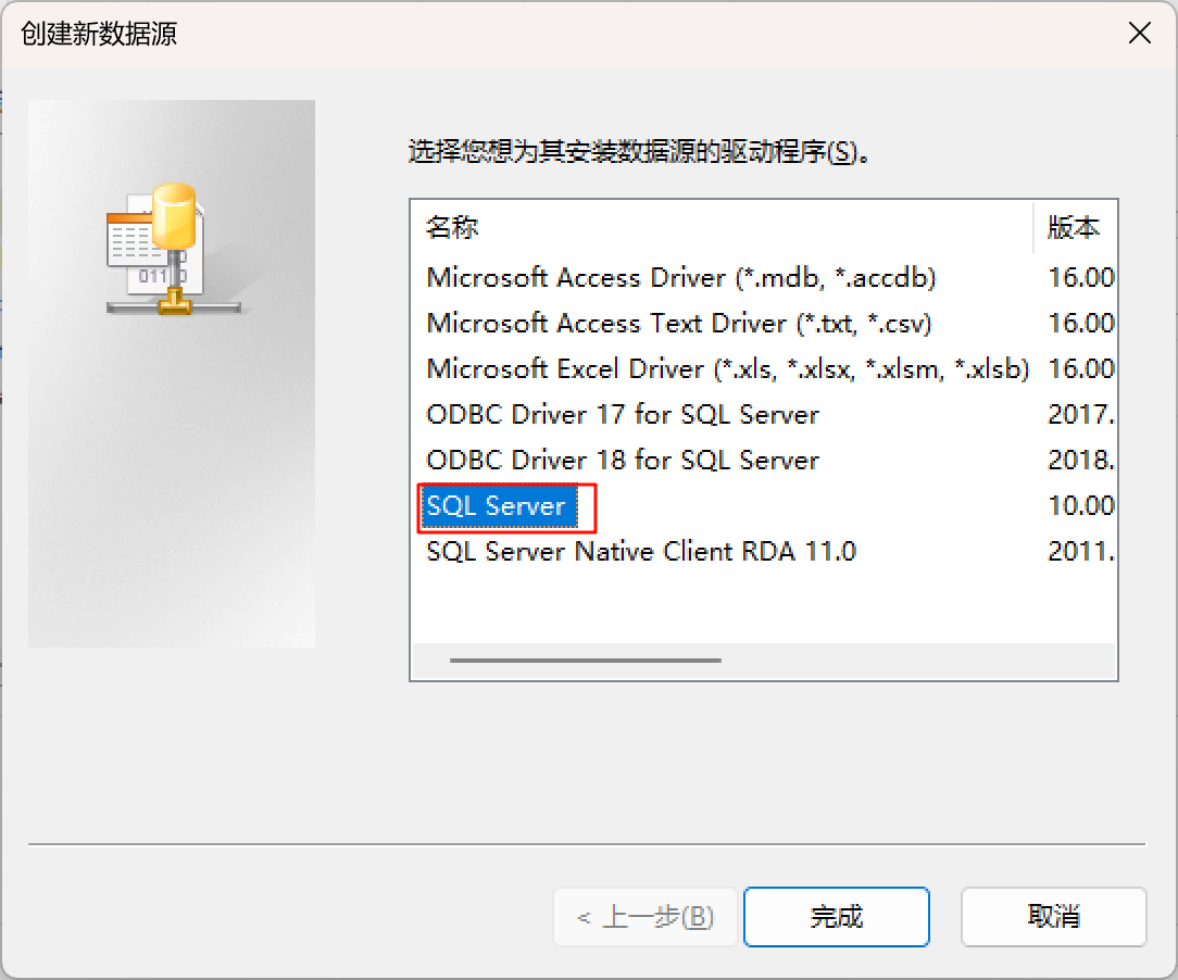 ODBC Driver 17/18 for SQL Server或SQL Server驱动,点击 “完成”。