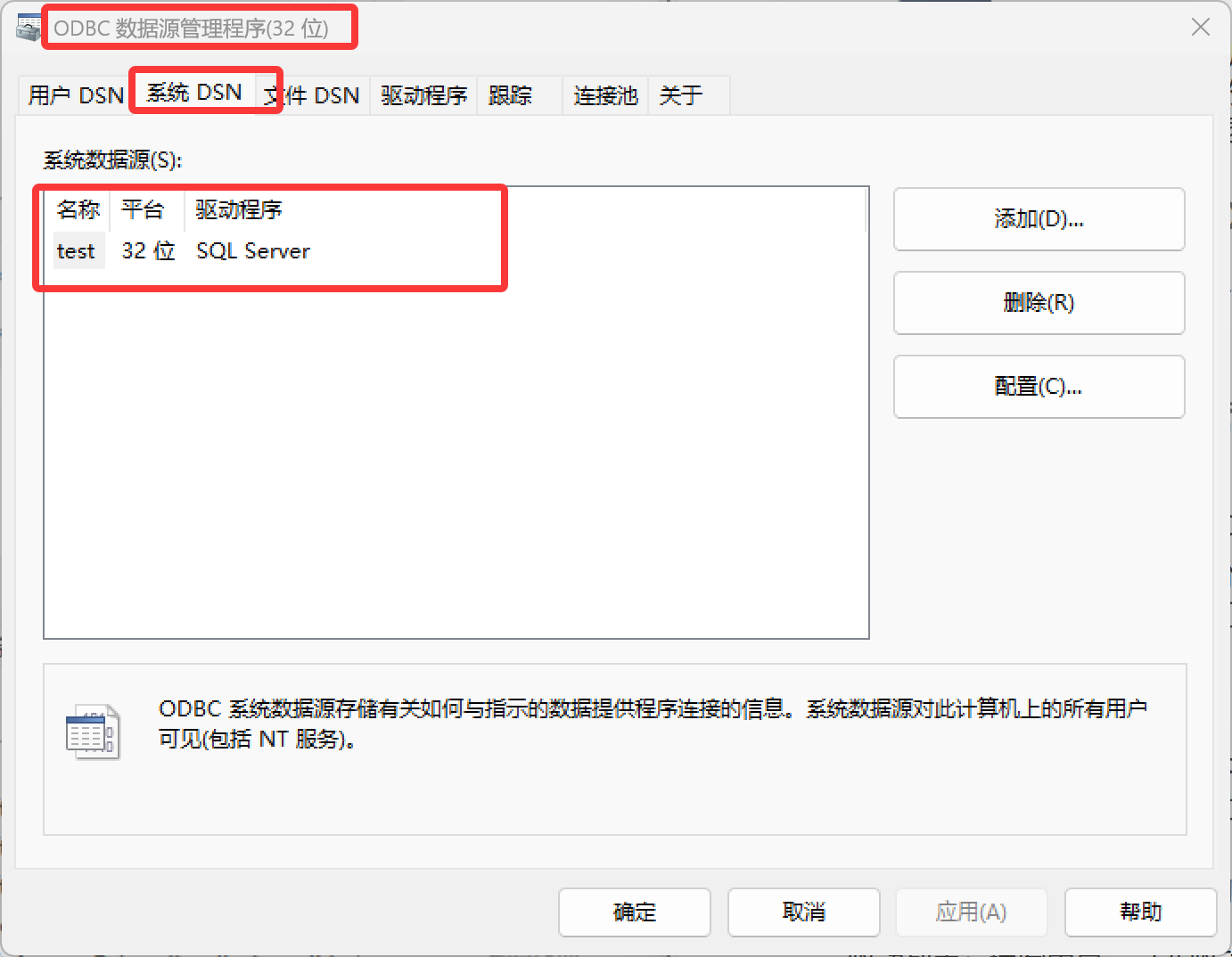 - 界面:打开后会看到 “用户 DSN”“系统 DSN”“文件 DSN” 等选项卡,博客中选择 **“系统 DSN”**(优点:此电脑所有用户可见,包括系统服务)。