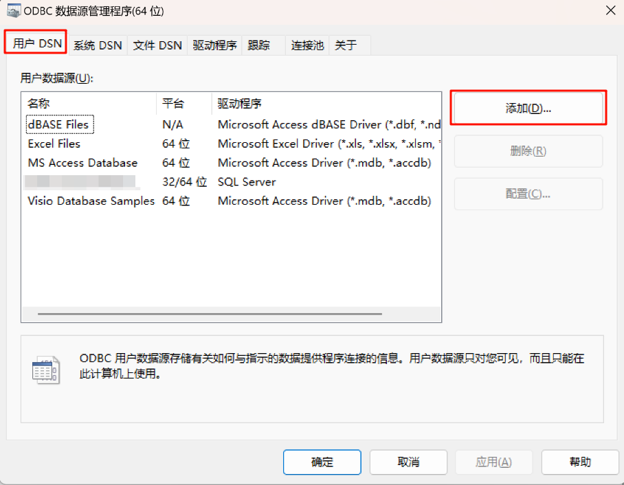 - 打开 “ODBC 数据源管理器” 后,博客中选择 **“用户 DSN”**(优点:仅当前用户可见,适合个人远程连接,避免多用户权限冲突);