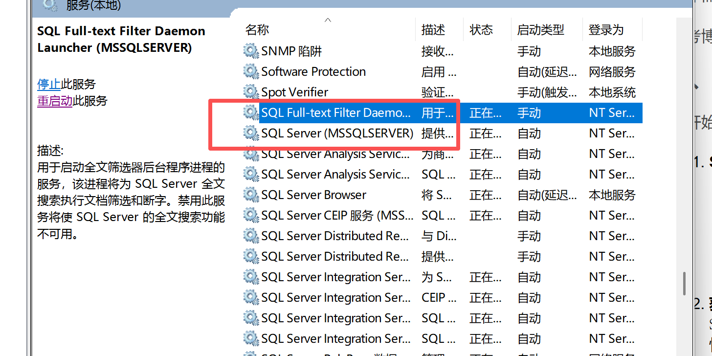 - 本地:右键 “此电脑”→“管理”→“服务和应用程序”→“服务”,找到 “SQL Server(MSSQLSERVER)”,确保状态为 “正在运行”(若未启动,右键 “启动”)。