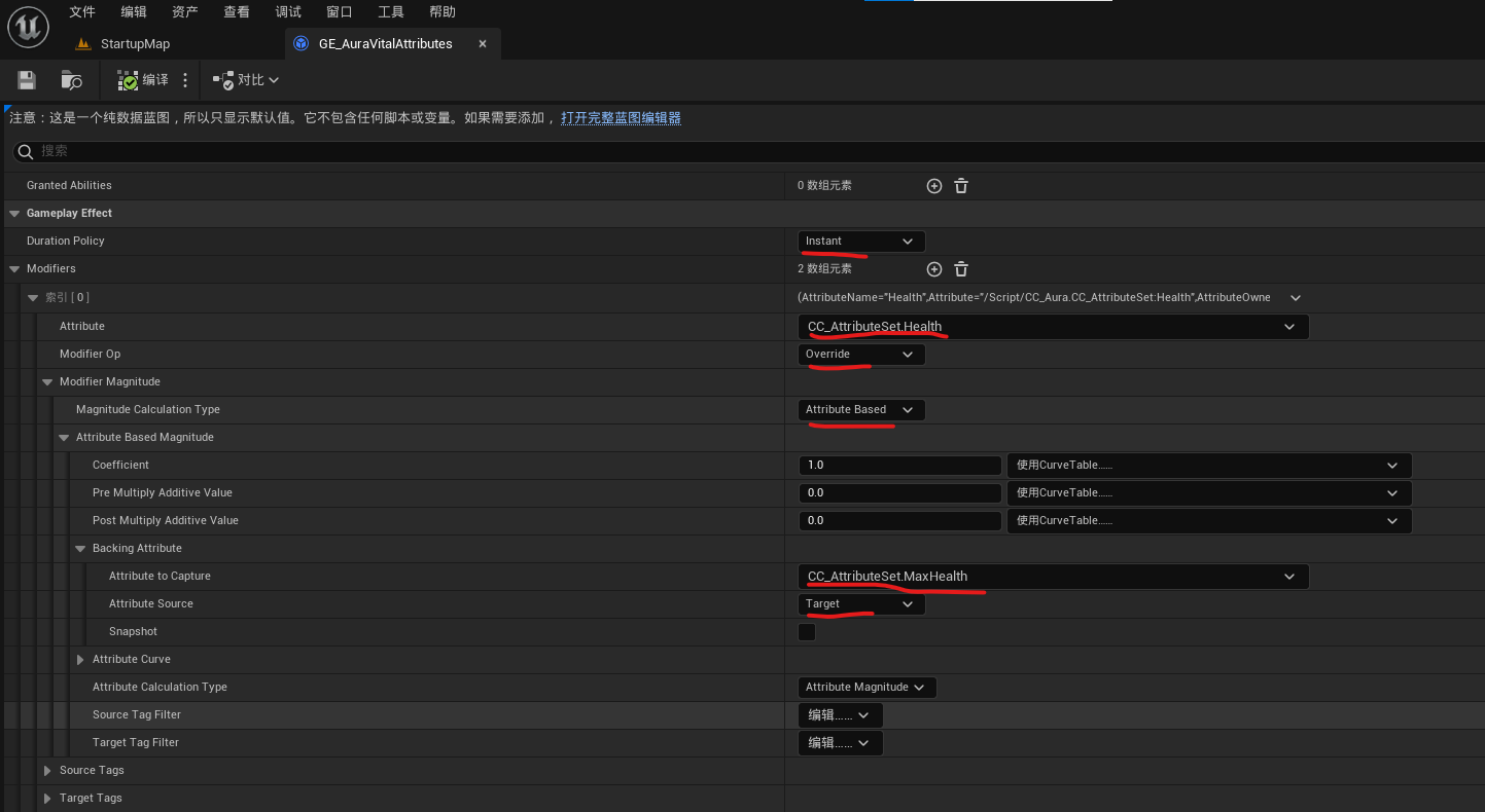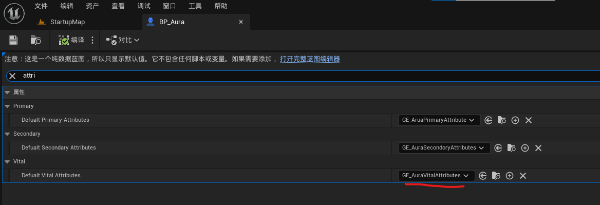UPROPERTY(BlueprintReadOnly,EditAnywhere,Category="Attributes|Vital")TSubclassOf<UGameplayEffect> DefualtVitalAttributes;3.在InitCharacterDefaultAttribute函数里添加应用效果: