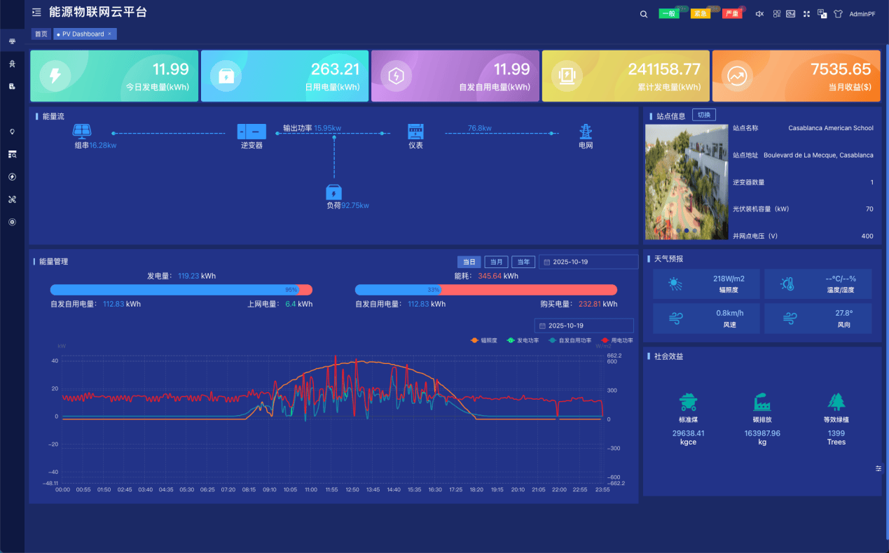 展示了单个光伏站点的基本信息,天气情况等数据,通过组态图的方式展示单个站点的能量流向图,以及当日、当月、当年的自发自用电量比例,实时辐照度曲线、发电功率曲线、用电功率曲线等数据。