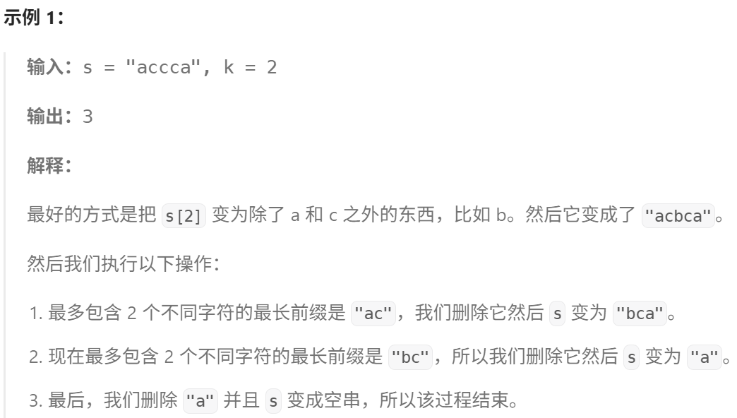 class Solution:def maxPartitionsAfterOperations(self, s: str, k: int) -> int:@cachedef dfs(i: int, mask: int, changed: bool) -> int:if i == len(s):return 1# 不改 s[i]bit = 1 << (ord(s[i]) - ord('a'))new_mask = mask | bitif new_mask.bit_count() > k:# 分割出一个子串,这个子串的最后一个字母在 i-1# s[i] 作为下一段的第一个字母,也就是 bit 作为下一段的 mask 的初始值res = dfs(i + 1, bit, changed) + 1else: # 不分割res = dfs(i + 1, new_mask, changed)if changed:return res# 枚举把 s[i] 改成 a,b,c,...,zfor j in range(26):new_mask = mask | (1 << j)if new_mask.bit_count() > k:# 分割出一个子串,这个子串的最后一个字母在 i-1# j 作为下一段的第一个字母,也就是 1<<j 作为下一段的 mask 的初始值res = max(res, dfs(i + 1, 1 << j, True) + 1)else: # 不分割res = max(res, dfs(i + 1, new_mask, True))return resreturn dfs(0, 0, False)