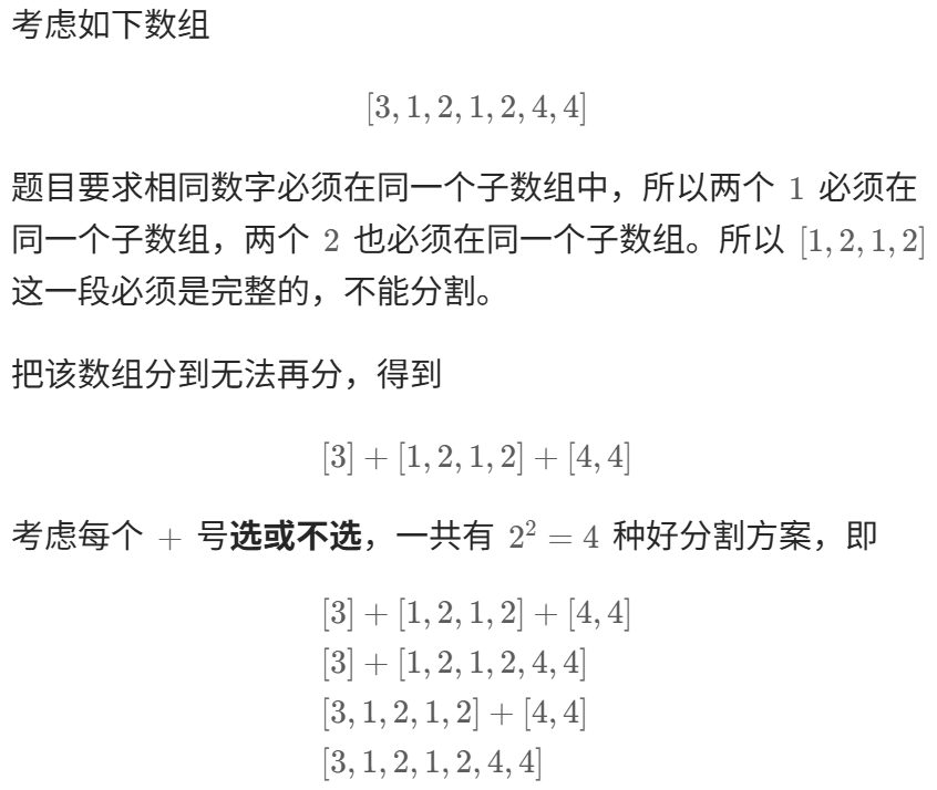 class Solution:def numberOfGoodPartitions(self, nums: List[int]) -> int:r = {}for i, x in enumerate(nums):r[x] = im = max_r = 0for i, x in enumerate(nums):max_r = max(max_r, r[x])if max_r == i: # 区间无法延长m += 1return pow(2, m - 1, 1_000_000_007)